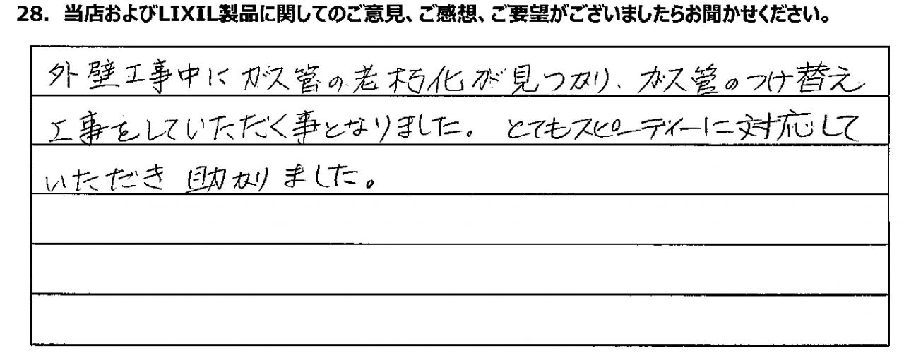 外壁工事中にガス管の老朽化が見つかり、ガス管の取替え工事をしていただくことになりました。とてもスピーディーに対応していただき助かりました。