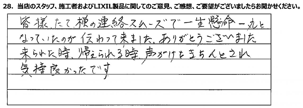皆様たて横の連絡がスムーズで、一生懸命一丸となっていたのが伝わって来ました。ありがとうございました。来られた時、帰られる時、声がけをきちんとされ気持ち良かったです。