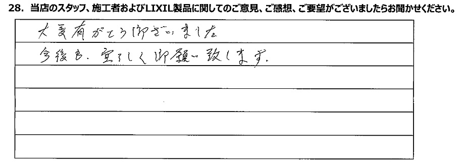 大変ありがとうございました。今後も宜しく御願い致します。