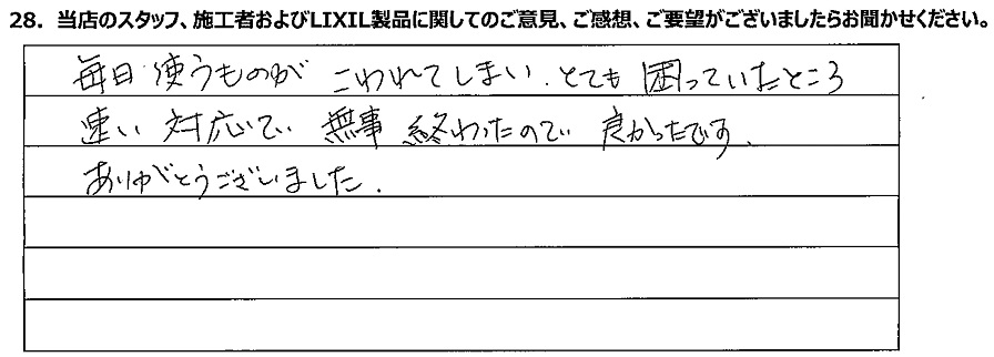 毎日使うものがこわれてしまい、とても困っていたところ速い対応で無事終わったので良かったです。ありがとうございました。