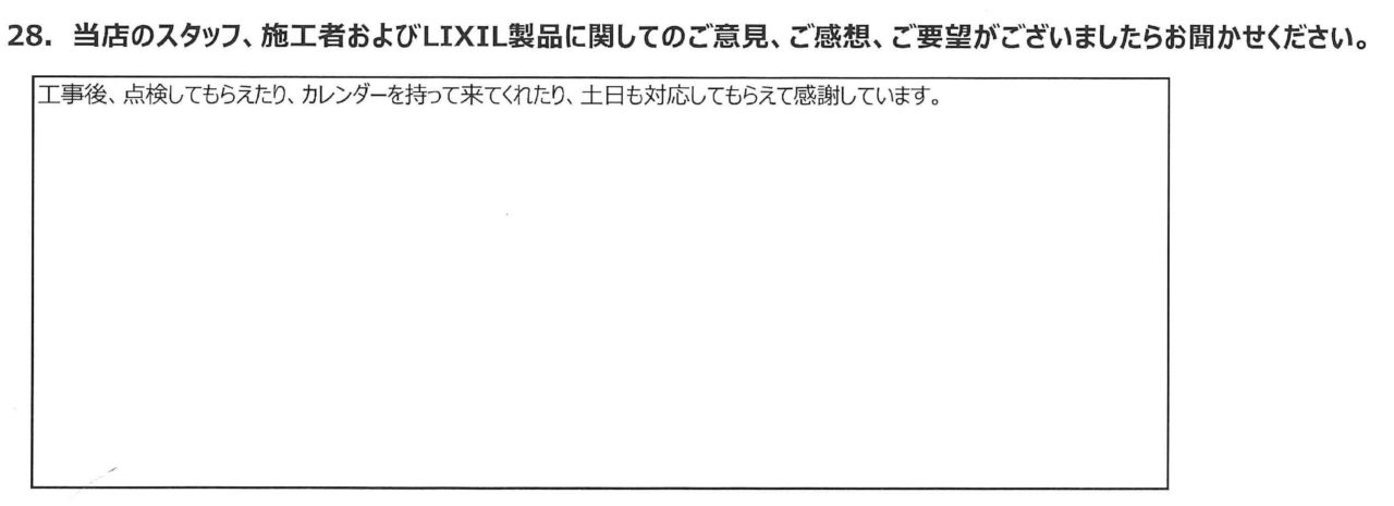 工事後、点検してもらえたり、カレンダーを持ってきてくれたり、土日も対応してもらえて感謝しています。