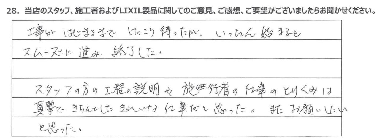 工事がはじまるまでけっこう待ったが、いったん始まるとスムーズに進み終了した。スタッフの方の工程の説明や、施工業者の仕事のとりくみは、真摯できちんとしたきれいな仕事だと思った。またお願いしたいと思った。