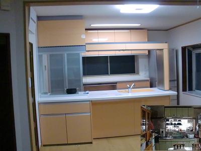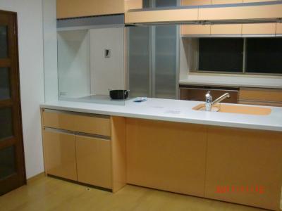 LIXILのゲート型キッチンを設置させていただきました。キッチン・リビングを一間にしてあるので、広々とした明るいマンゴー色のキッチンが映えますね。