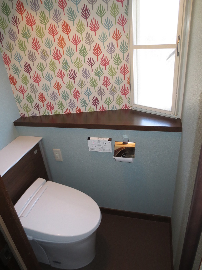 便器の入替えと内装だけの工事ですが施工前と施工後ではガラっとイメージが変わりました。キャビネット付の便器を採用したので掃除用具やトイレットペーパーがすっきり収まり、壁には施主様お気に入りのアクセントクロスを張って明るく楽しい感じのトイレに仕上がりました。
