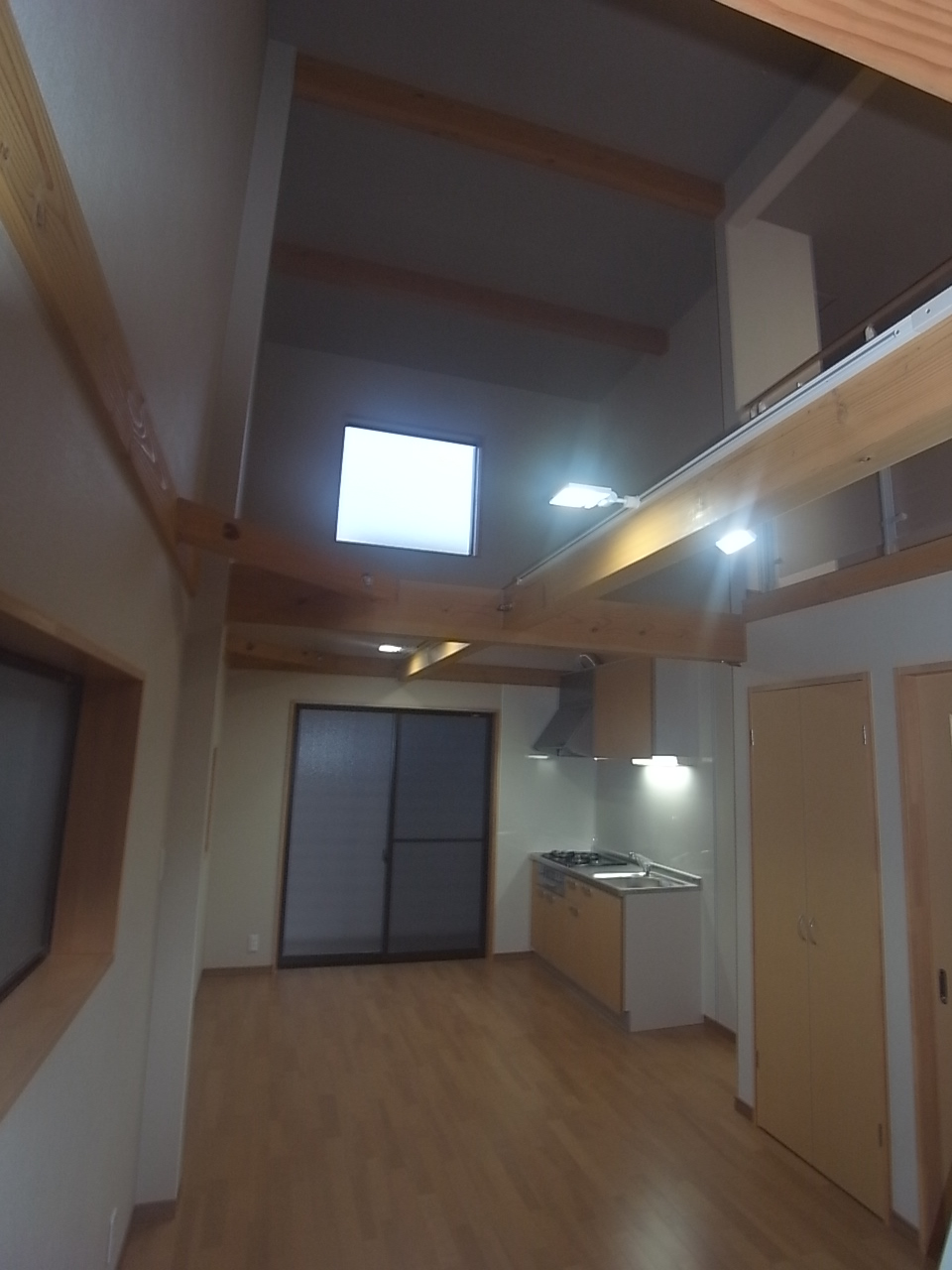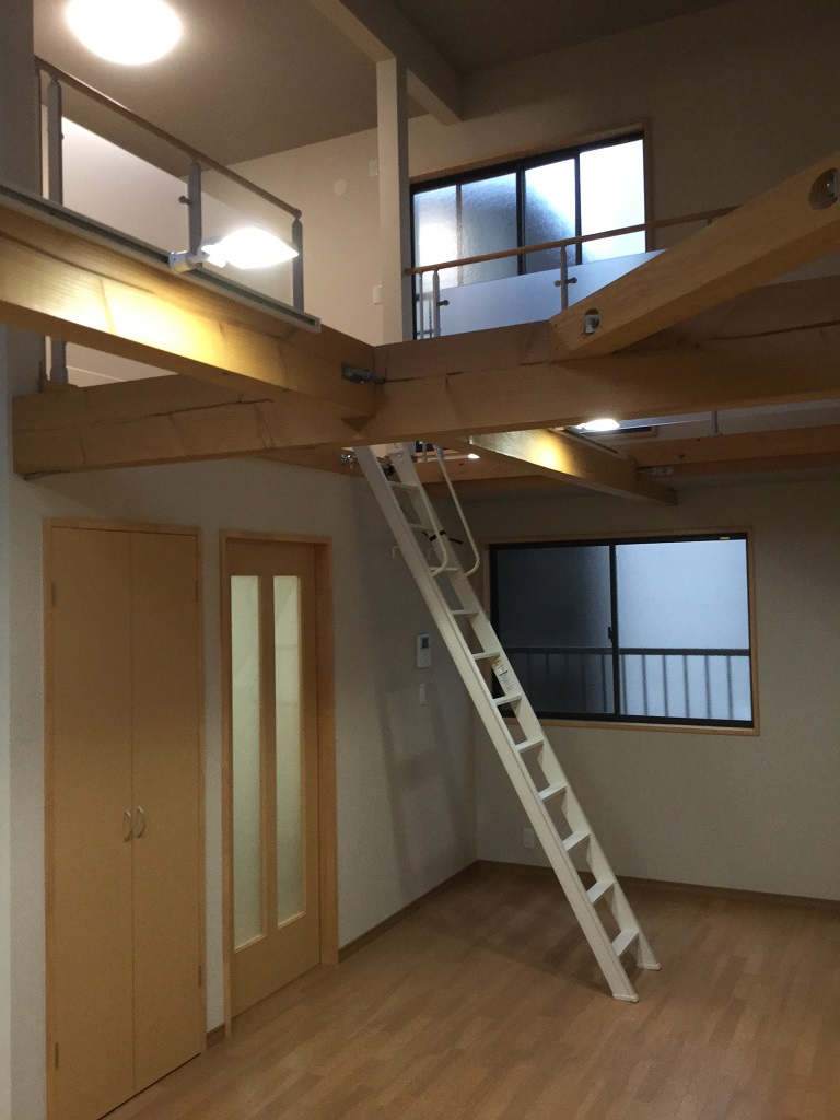 一昨年新築したお客様の別宅で、数年間空家になっていました。天井が通常よりかなり低く非常に圧迫感のあるお宅でしたが、1階の天井を撤去し吹き抜けにすることによって開放感のある大空間になりました。2階部分はロフトにし、明るさを保つよう半透明の手すりを設置しました。
