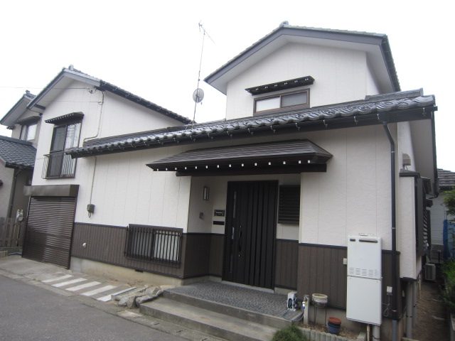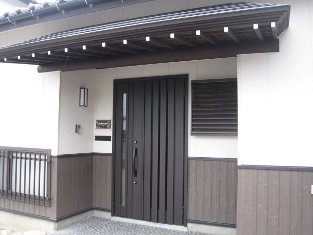 既存住宅の外観が和風だったので、民芸調のイメージで腰壁のカラーを変え、玄関ドアも外観に合わせて取替えました。お客様のご意見を伺いながらイメージを決定し、全体的に統一されたモダン和風な外観に仕上がりました。(担当:長谷川)