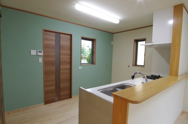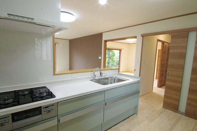 キッチンは淡いグリーン。天板はLIXILがおすすめするセラミックトップ。人造大理石トップとは