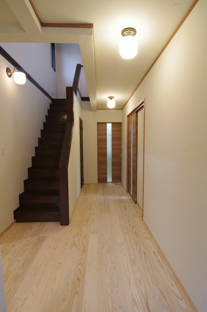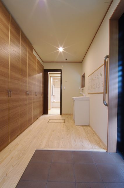 裏玄関。カーポートから車椅子で入れる様に。左側は一面収納。右側奥の
