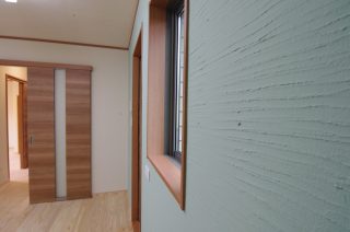 壁・天井共珪藻土塗り。色が異なる所にはパターンを付けアクセントに・・・