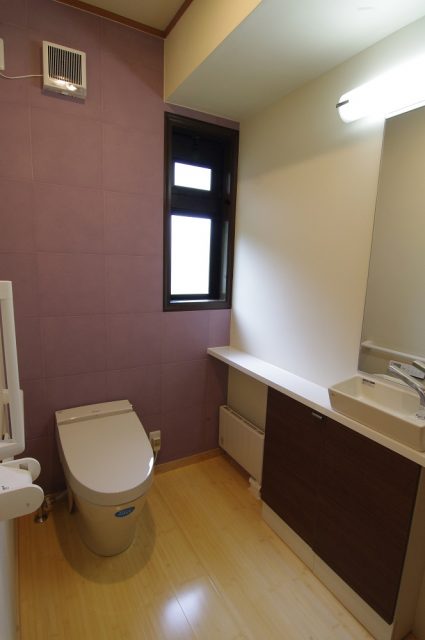 少し広めのトイレ。介助も楽に出来ます。正面には珪藻土より匂いや