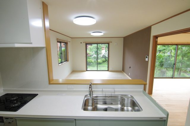 キッチンからLDKと寝室(右側)を見渡せます。旦那様の様子もさりげなく確認出来、安心して