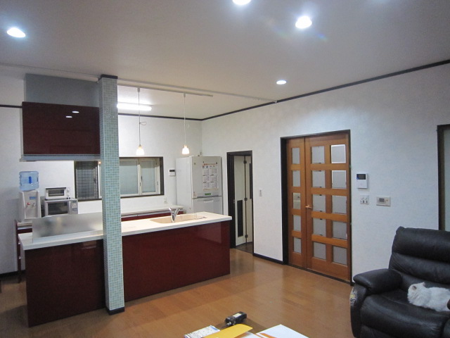 全体的に水まわりが老朽化し、浴室・洗面・キッチン・トイレと全てリフォームしました。特にこだわったのは、もともと独立型だったキッッチンとリビングの間仕切り壁を撤去しオープンなLDKにした事です。二人の娘さんと一緒にお料理がしたいとのお母様のご希望でアイランド型のシステムキッチンを採用。構造上抜けなかった柱には奥様お気に入りのモザイクタイルを貼りました。ご家族皆さんのこだわりがたくさんつまったステキなLDKになりました。