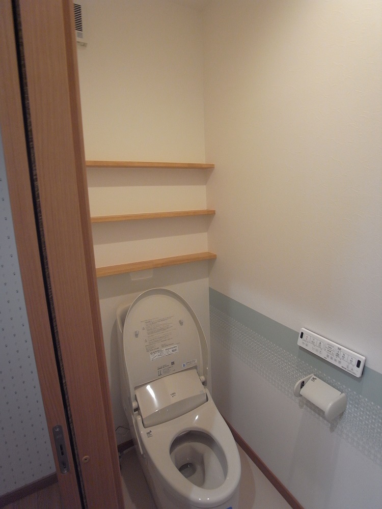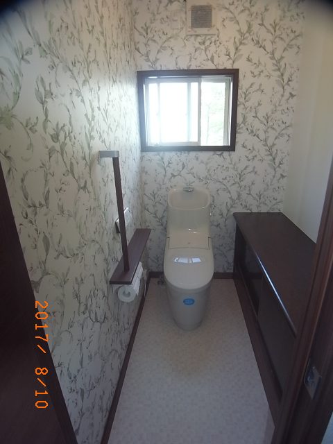 ↑トイレ内カウンターは既存を使用。入口の段差を無くし、棚手摺を新設しました。