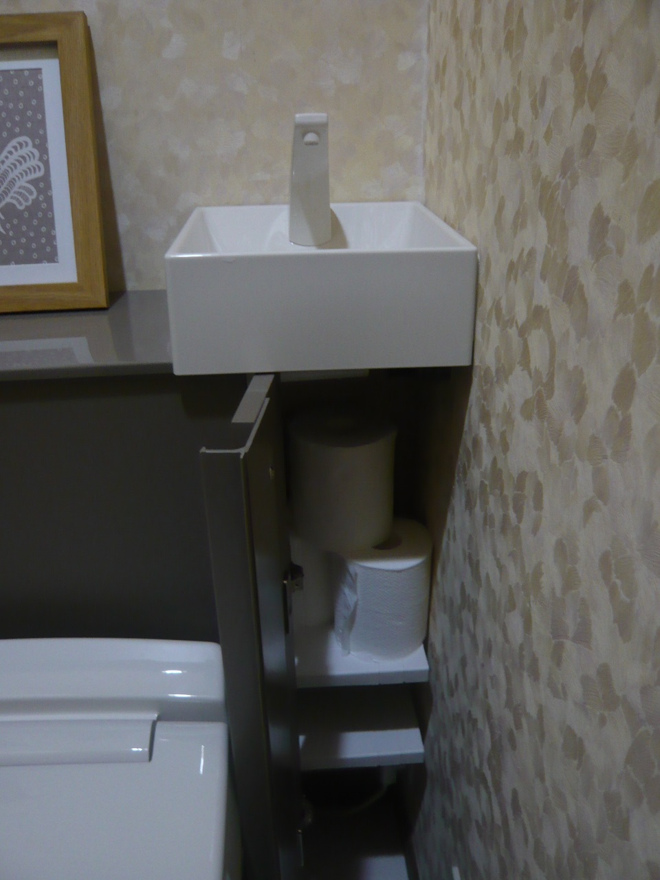 新築されてから30年間使用されていたINXA製のトイレ。古くなり温水洗浄機能もなかったため、温水洗浄機能付きのトイレにしたいとのご相談でした。来客が多いとの事でしたのでトイレで手洗いまで済ませられ、収納も備えたキャビネット付トイレをご提案。トイレットペーパーの予備や掃除用具も収納に納まりスッキリとした空間へ。キャビネットカラーはカタログを見て気に入られた新色です。