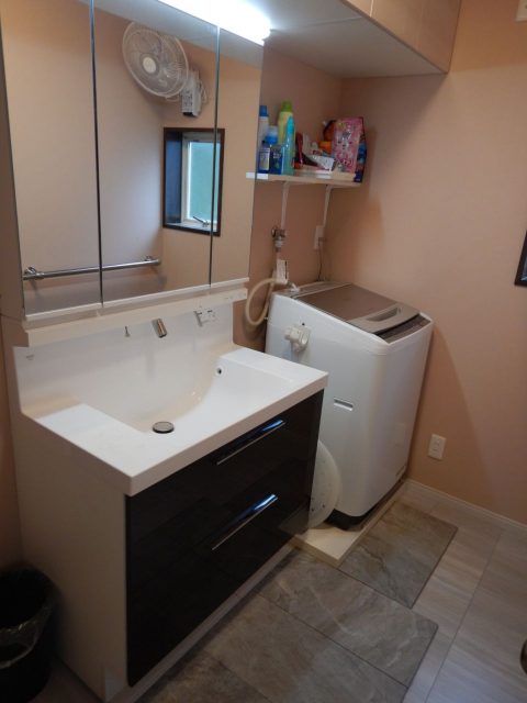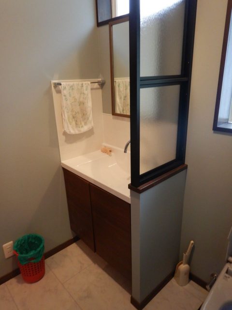 浴室の入口交換に伴い、位置も変え暗くなりがちだった廊下に光が入る様に。脱衣室は設備位置を変える事により、将来的に洗濯機を買い換えても大丈夫なスペースを確保しました。また、トイレスペースを広げ、車椅子でも快適に使用できるよう考えました。(担当:鈴木)