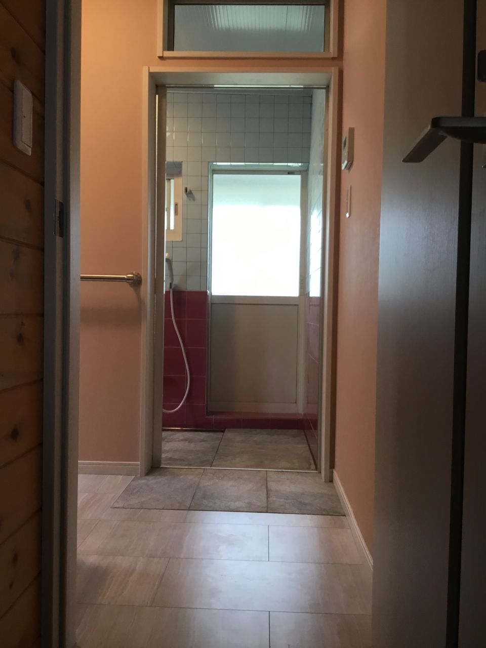 妙高市にお住まいのN様。築33年のお住まい。在来浴室から水漏れがあり、浴室、脱衣室、トイレをリフォーム。浴室入り口の位置を変えることで、廊下まで光が届く明るい空間に。お客様のご要望でもあったトイレは、空間を広げ入り口を片引き戸にすることで、車椅子でも使いやすい空間になりました。