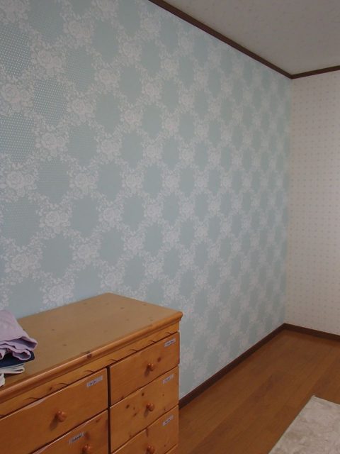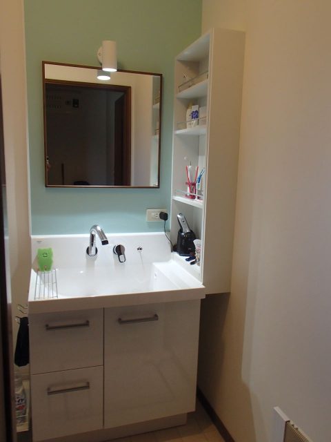 洗面台が古くなり、照明等電気系に不安があり思い切ってリニューアル。使い勝手を重視して洗面のシンクと横の棚はLIXILの商品を採用。鏡は施主様のこだわりである一面鏡。(支給品) 背景は、さわやかなグリーンでまとめました。2Fは大きな1部屋を奥様と娘さんでシェア。間仕切りにはそれぞれお気に入りの壁紙をチョイスし、後から棚も増やせる様広く下地を入れました。担当:青柳