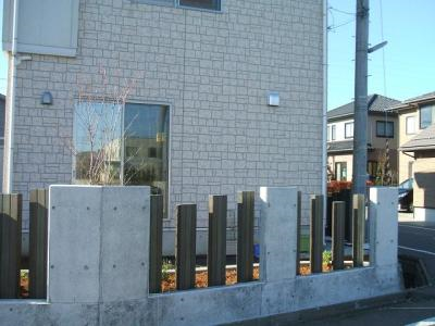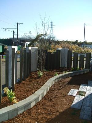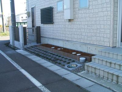 そろそろ外回りをとお話を頂き、ご希望の雰囲気やお使いになりたい部材の話しからスタート。大まかな所をお聞きしてプランに入りました。旦那様はかねてからの希望のコンクリート壁を取り入れてほしいというお話で、奥様はメンテナンスが楽で、でも枕木みたいなものをとのこと。この2つを組み合わせて視線をさえぎるように考えました。玄関脇もインターロッキングと緑を組み合わせたり、花壇を少し上げて作りました。シンボルツリーも植えられ生き生きとしたお庭になりました。