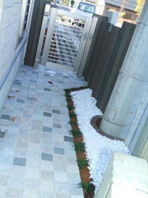 玄関横のインターロッキングと庭を門扉で仕切りました。