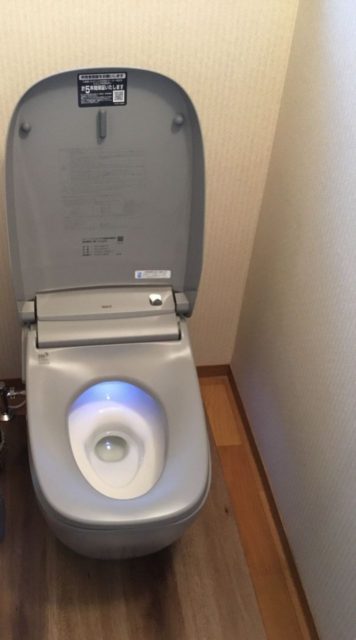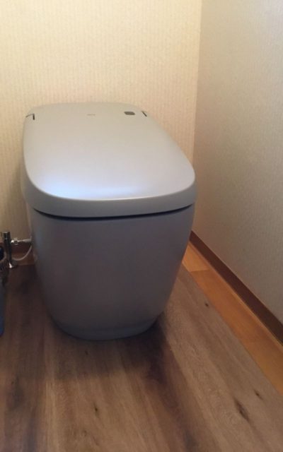 上越市にお住まいのU様。トイレから水漏れしており、新しいトイレに交換したい。とご相談いただきました。LIXILの高機能タンクレストイレをご採用いただき、落ち着いた広々空間トイレへ。便器色のノーブルグレーに合わせ、床も張替えました。